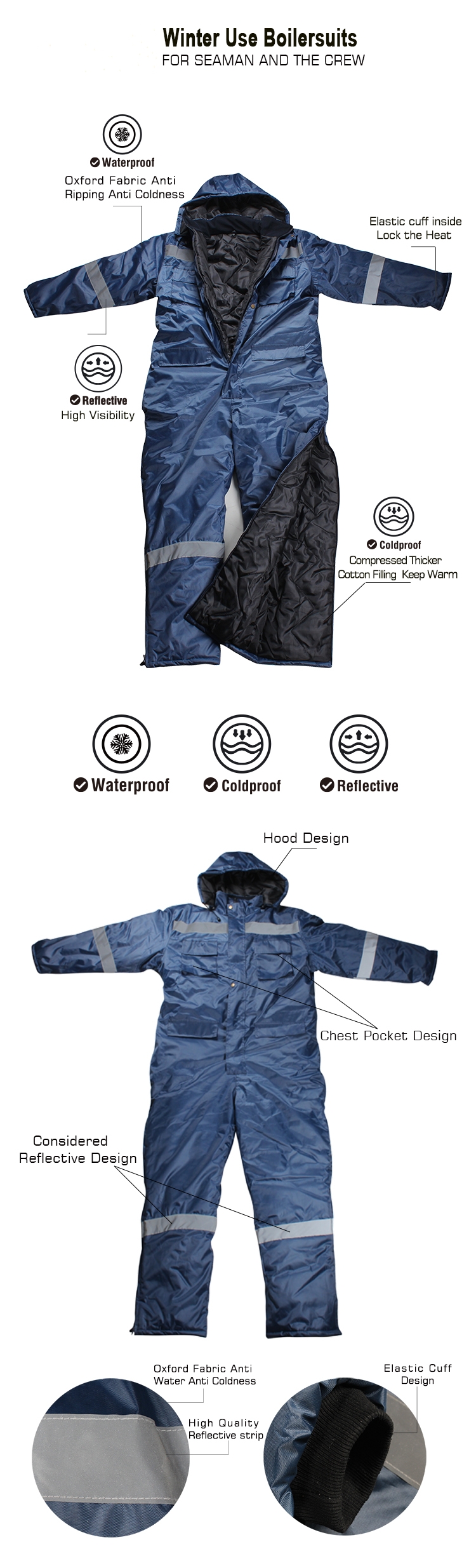 Winter Workwear Coverall Boilersuits A winterWorkwear Coverall Boilersuits, made of nylon or a similar synthetic fabric; polyester inner lining. Hood is trimmed with acrylic simulated fur.Cold winter, outdoor workers, especially the staff need extra cold sea protection.The use of cotton tailored jacket, wind resistant, durable.Professional custom jacket for cold marine vessels, oil tankers, chemical tankers crew wear.