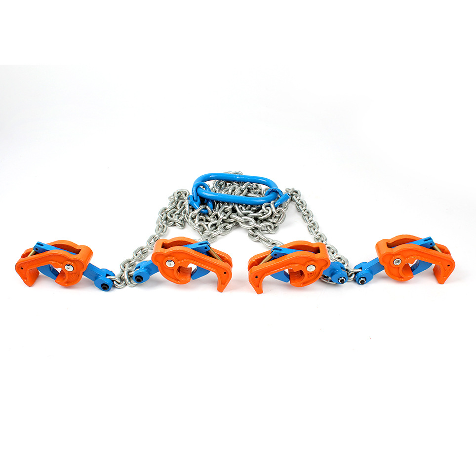 Quadruple chain sling with master link & drum hooks for lifting two drum barrels simultaneously.