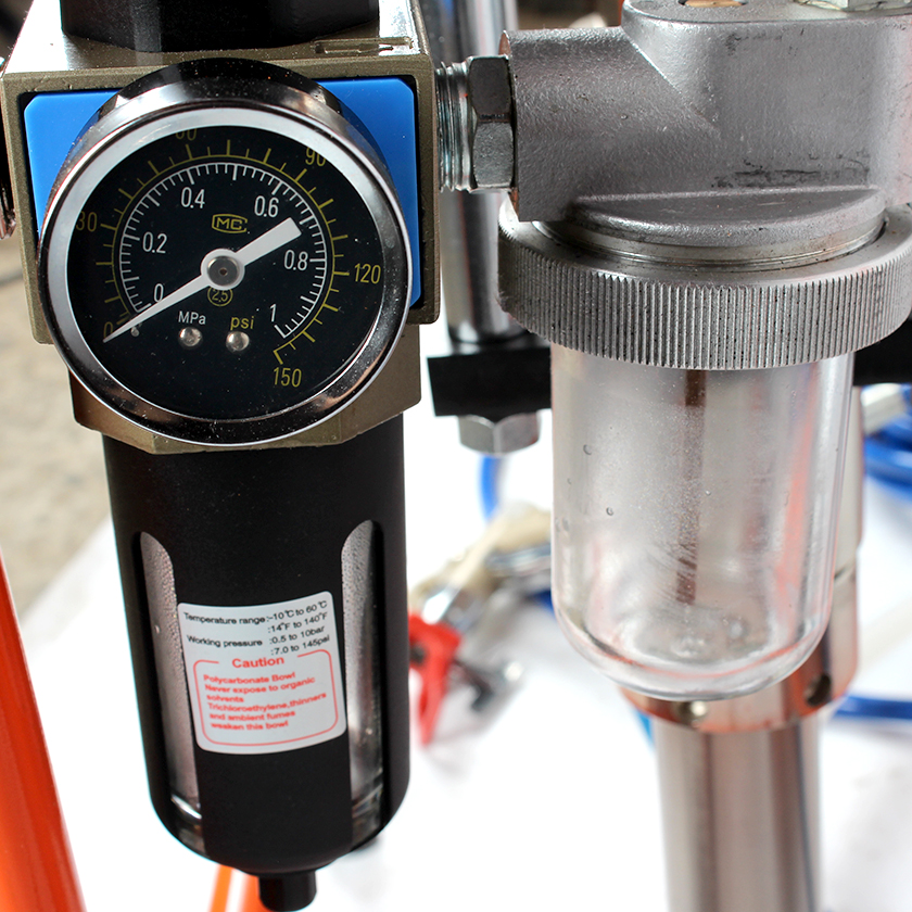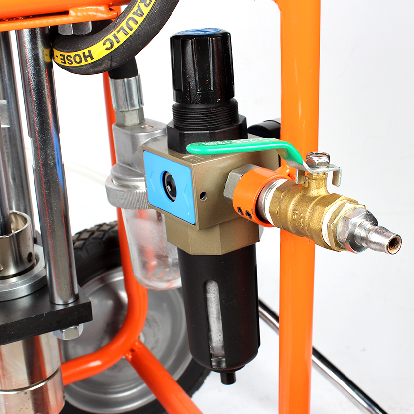 Hardened stainless steel fluid pump and stainless steel piston rod, suitable for use with both oil -based and water based coatings Durable V-packings made of Teflon and Leather Small size and light wei ght Built-in air filter group with regulator