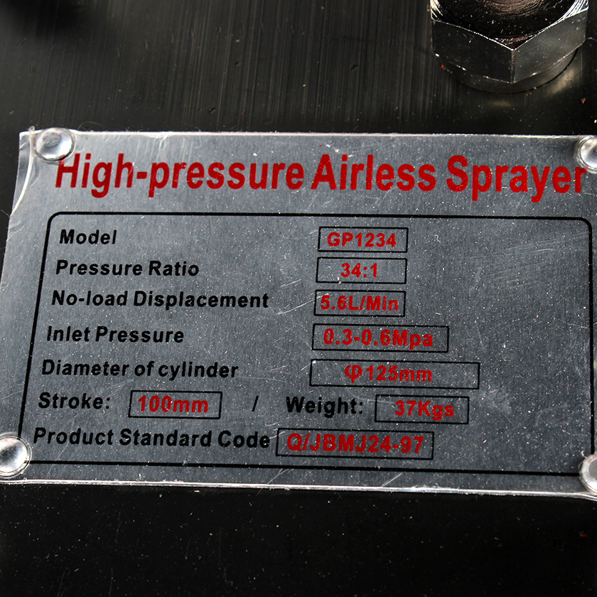 AIRLESS PAINT SPRAYER GP1234 is a lightweight professional airless paint sprayer with fluid pressure ratio 34:1, flow rate of 5.6L/MIN. GP1234 comes equipped with 15mtr high pressure hose, complete with spray gun and nozzle.The pump of the machine is made of stainless steel.