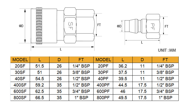 Female Thread Type:20SF,20PF,30SF,30PF, 40SF,40PF, 400SF,400PF, 600SF,600PF, 800SF,800PF,